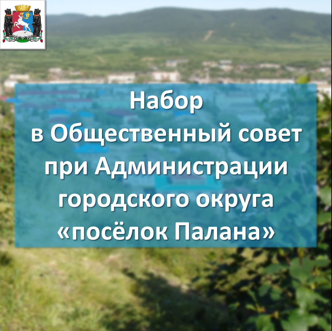 В соответствии с ФЗ 21.07.2014 №212-ФЗ Об основах общественного контроля в РФ, Администрация городского округа "поселок Палана" объявляет о наборе в количестве 3 человек членов Общественного совета - постоянно действующем совещательном органе, созданном в целях обеспечения согласования общественно значимых интересов граждан городского округа "поселок Палана", развитии взаимодействия между институтами гражданского общества и органами местного самоуправления, а также повышения гласности и открытости деятельности Администрации городского округа "поселок Палана".